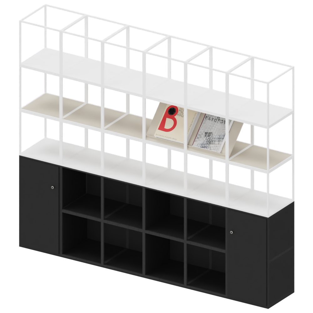 Bogreol med rigelig opbevarings- og udstillingsplads. Hylder og magasinholdere kan tilføjes og udskiftes efter behov, ligesom skabe. Åbne hylder øverst og lukkede nederst giver et friskt look, der ikke tager for meget plads, samtidig med at der er masser af opbevaringsmuligheder. Ideel til biblioteker, butikker eller kontorer.