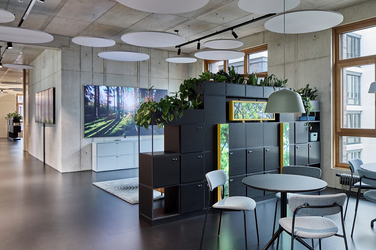 Le système GRID offre un design épuré pour les cloisons et les casiers des bureaux Visual Art à Hambourg.