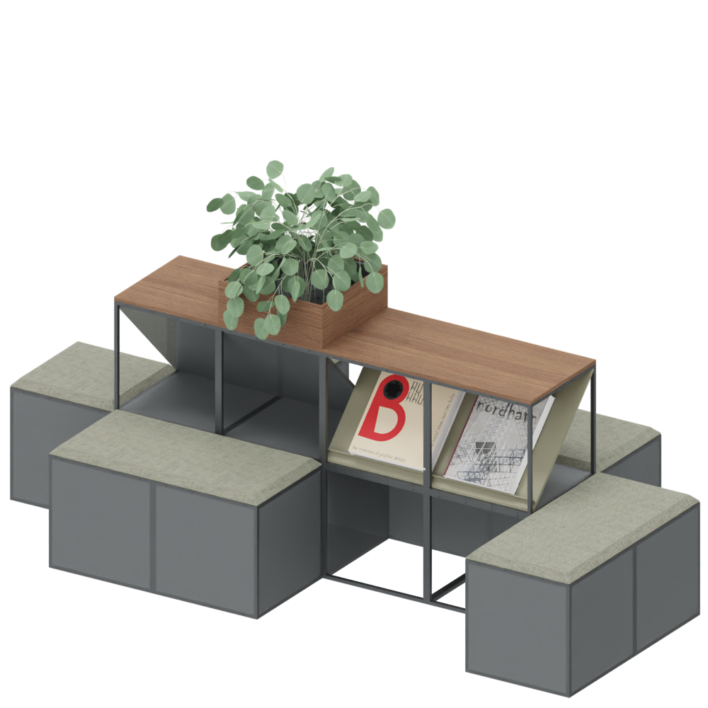 Seating options all around the veneered table top, makes for a versatile seating island that can be placed in both larger and mediumsized halls and rooms, such as a waiting room.